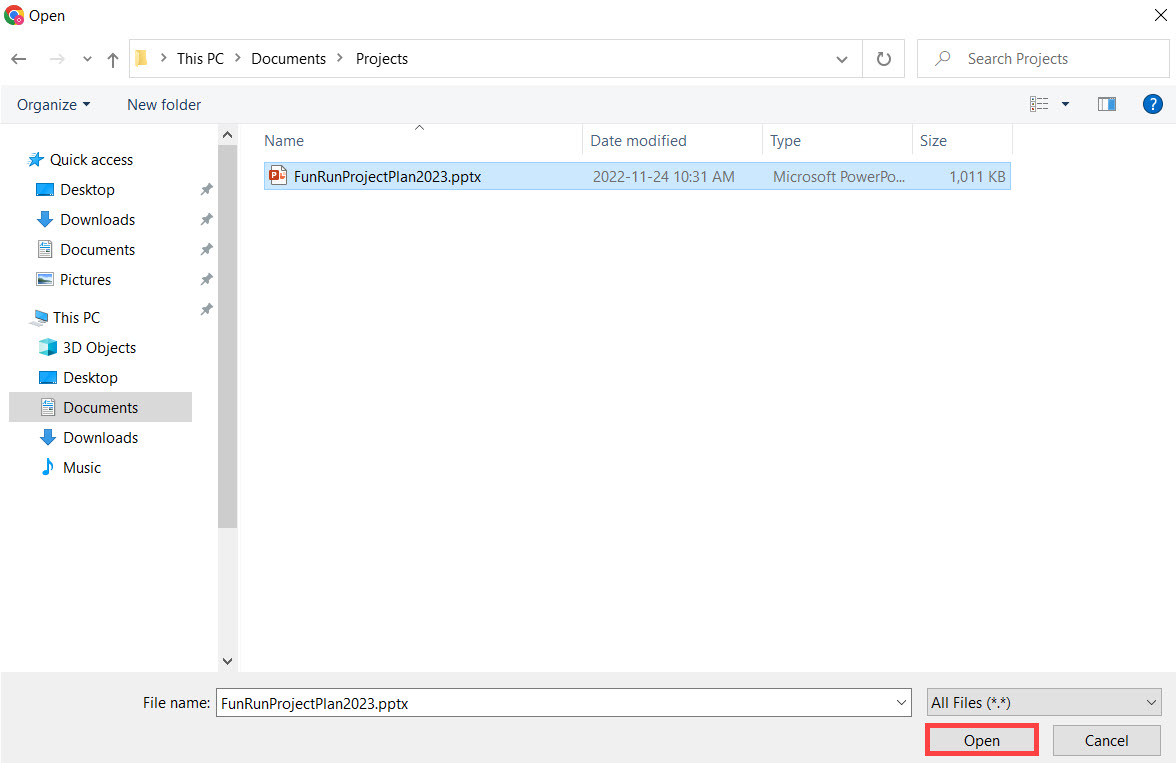 In your devices’ file explorer, navigate to the documents stored on your device. Select any of the files you wish to upload and click on the Open button.
