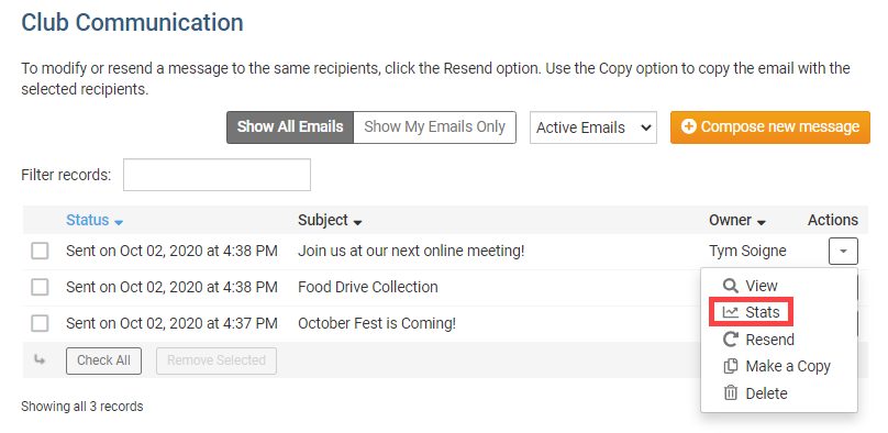 You are now on the Club Communication screen, where you can compose a new email, or view and manage all the emails you have sent. Click the Drop-down Arrow on a given email.