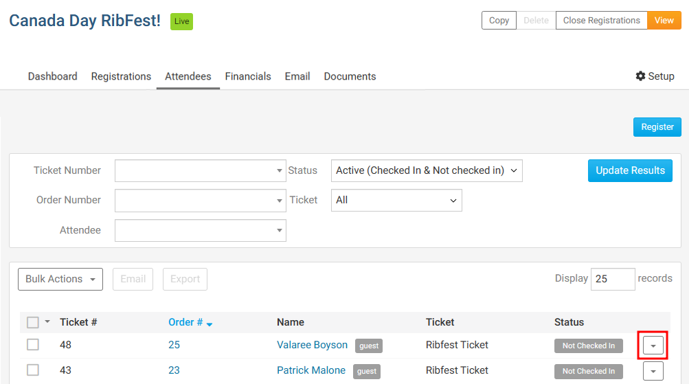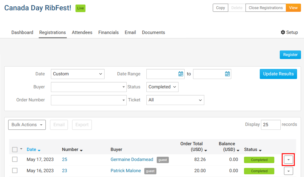 Email updated invoice after refund is processed - If enabled, an updated invoice of the registration order will be emailed to the ticket buyer.