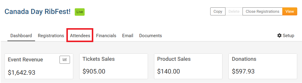 On the Event List page, click the Manage button on the event which you want to cancel the order or ticket for.