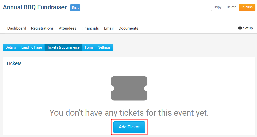 This allows you to setup tickets for the event. Clicking on Add Ticket will open a window where you can enter the following details regarding the ticket: