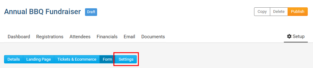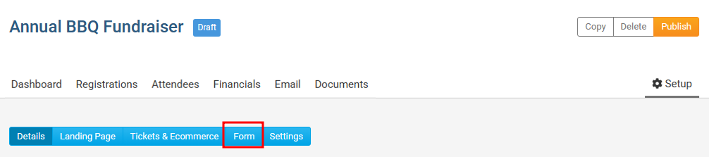 After you have completed the Tickets & eCommerce page, you can review and update the Registration form. To do this, please click Form near the top of the page in the blue bar.