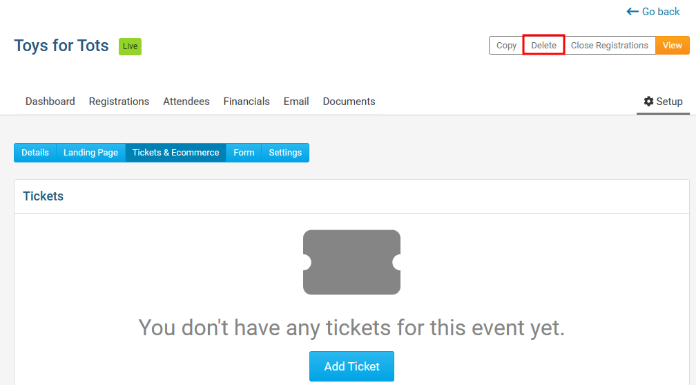 Events still in draft mode or live events without any registrations can be deleted, in the event that they were created in error, as a test event, or they are simply no longer needed.
