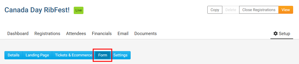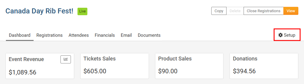 Near the top right, click on the Setup button to begin editing the event.
