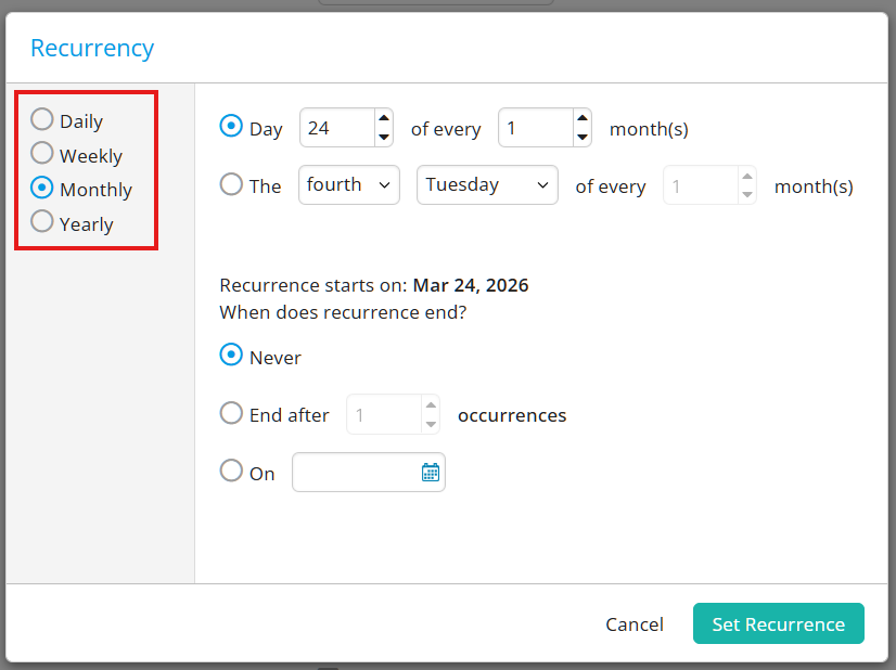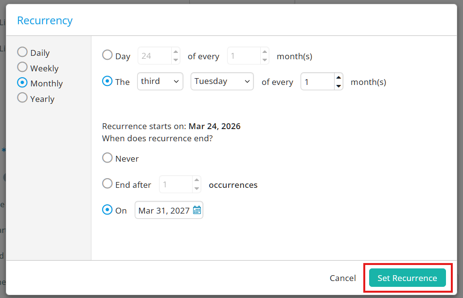Click on the Set Recurrence button to save your recurrence options.