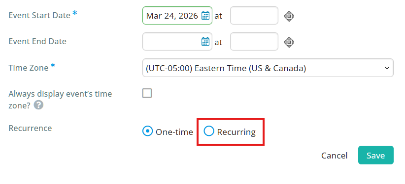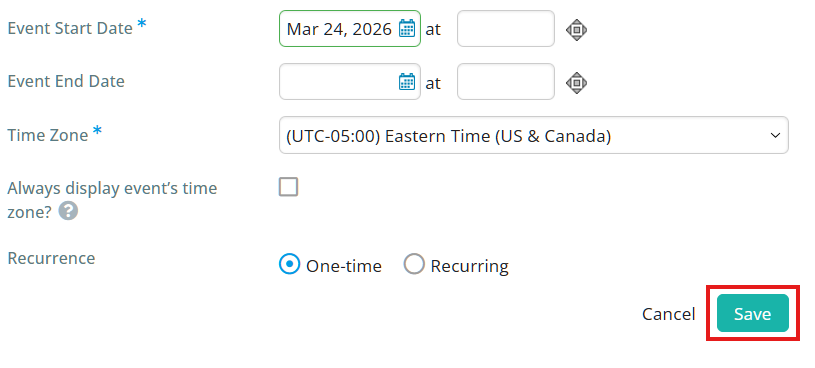 After filling out the event details, you can then use the Recurrence option depending on whether you are creating a one-time event, or the event will be recurring on a regular basis. If your calendar item is a standalone, one-time event, select One-time and then click the Save button