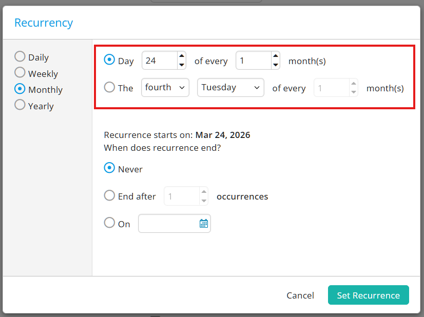 After selecting the base frequency, you can specify more direct details regarding the recurrence of the event. For example, for a Monthly recurrence, you can have the event recur: