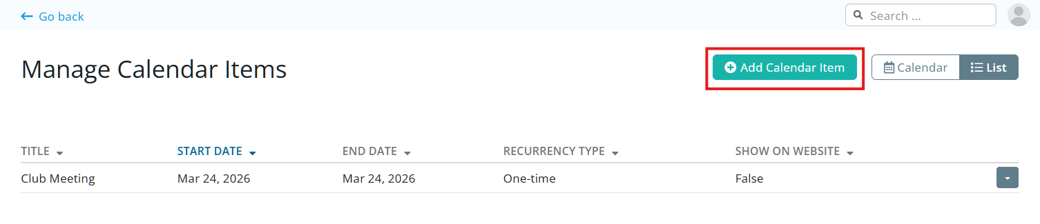 To create a new calendar item, click on the Add Calendar Item button in the top right corner.