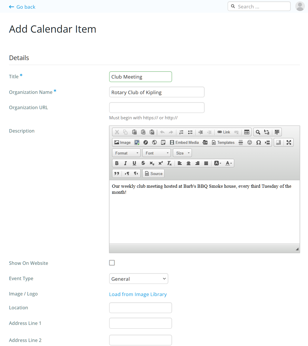 Click on the Save button to save your Calendar Item.