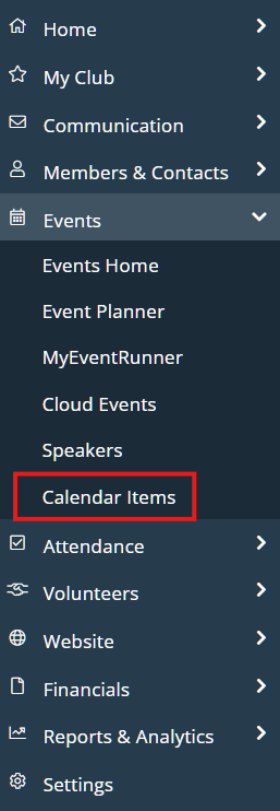 On the left-hand menu, click the arrow to the right of Events, then click on Calendar Items to view your list of current calendar items.