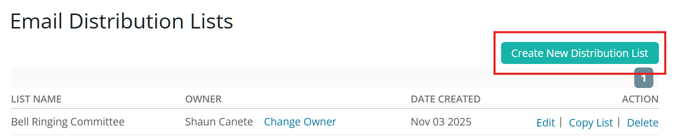 You are now on the Custom Distribution Lists page, where you can see a list of all of your custom distribution lists. Click on Create New Distribution List to create a new list. Alternatively, click on the Edit action for an existing list to make changes.