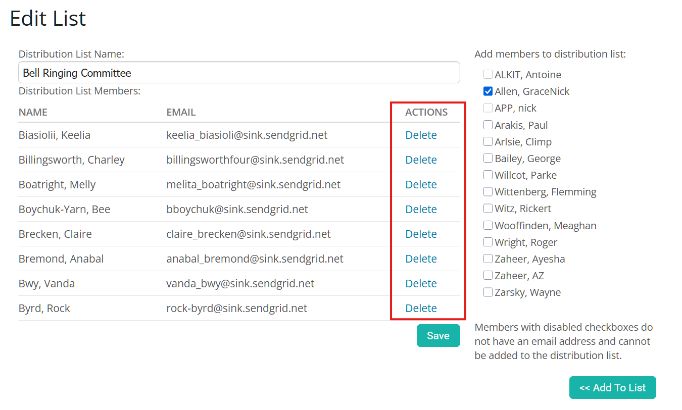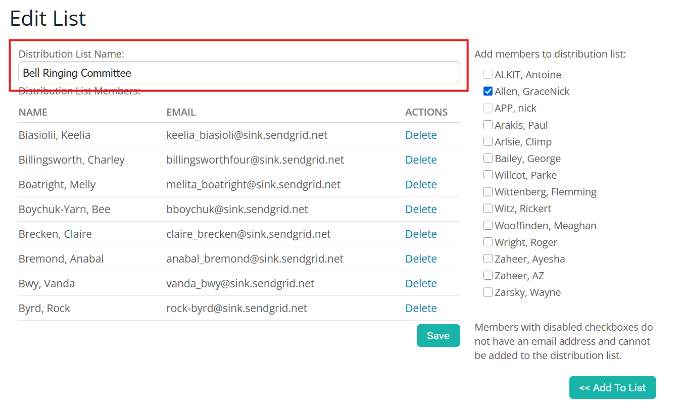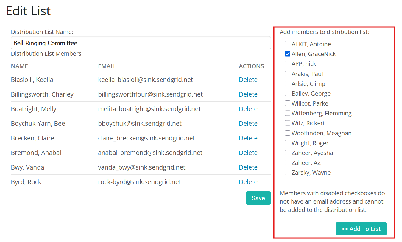 Select the check box next to an individuals name and click on the Add To List button to add them to the distribution list.