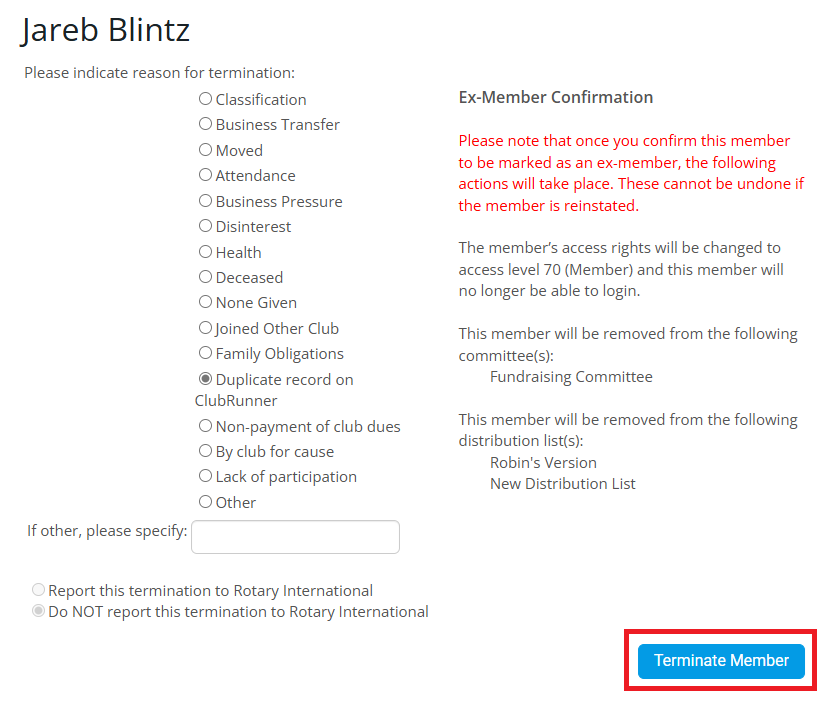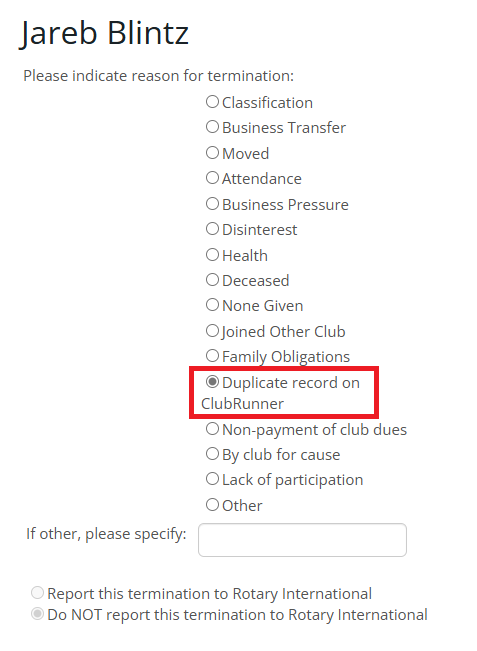 Select Duplicate record on ClubRunner as the termination reason from the available list. If you are with a Rotary club, the option to not report this termination will be selected, as duplicate terminations are not reported to Rotary International.