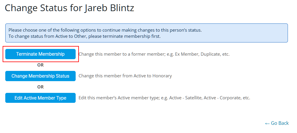 Once you are ready, click on the Terminate Member button to complete the status change for the selected member.